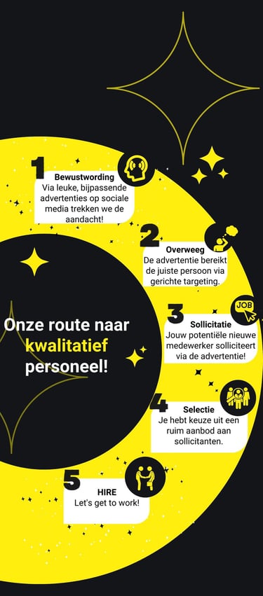 Bij ons draait het allemaal om jouw succes! Wij zijn gespecialiseerd in het creëren en uitvoeren van innovatieve campagnes op verschillende kanalen, zoals TikTok, YouTube, Instagram, Indeed, LinkedIn en Google. Hierbij zorgen wij ervoor dat jij gedurende de gehele candidate journey optimaal zichtbaar bent - vanaf het eerste contactmoment tot aan de sollicitatie.